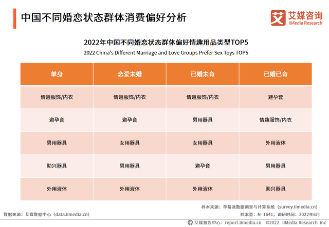 艾媒咨詢發(fā)布的《2022-2023年中國情趣用品行業(yè)及消費行為調(diào)查分析報告》顯示,中國消費者最為偏好的情趣用品類型包括避孕套、情趣內(nèi)衣,占比分別為55.9%和53.8%。報告還顯示,單身、戀愛未婚、已婚已育群體都比較偏向于使用避孕套,涉及人群廣泛。