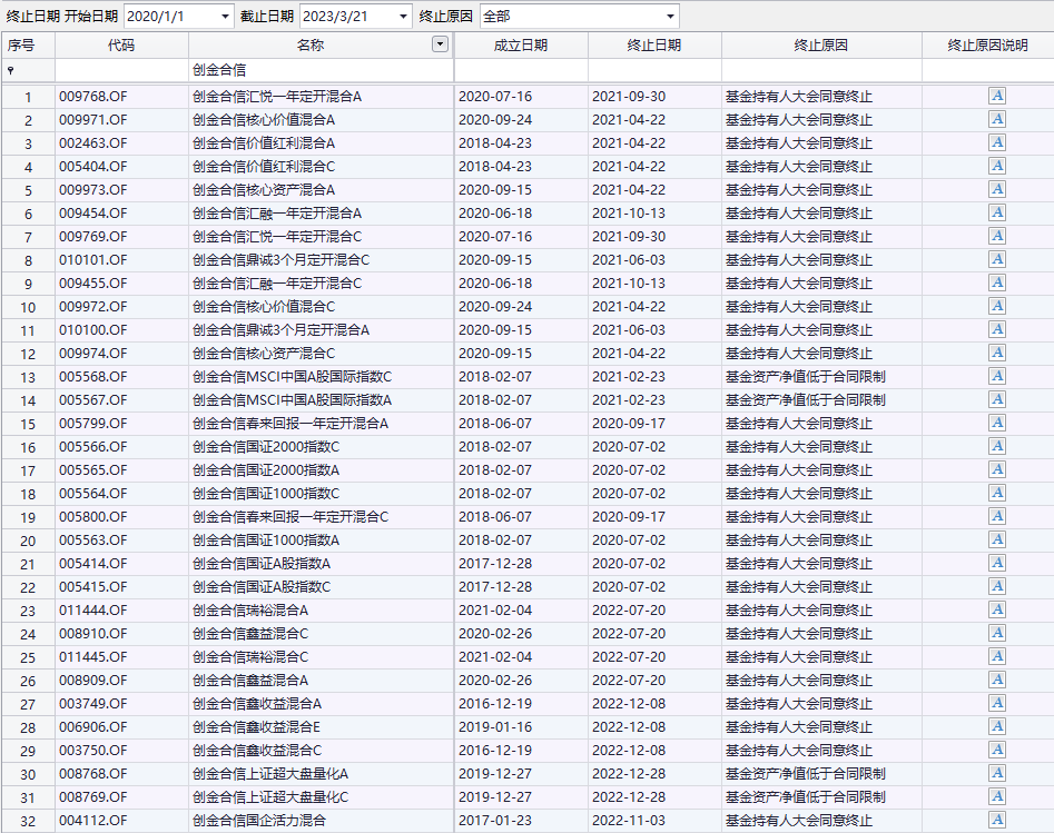 另外,也有些基金觸及5000萬元生死線而清盤。據(jù)Choice顯示,2020年至今,創(chuàng)金合信基金有32只產(chǎn)品(A、C類份額分開計(jì)算)清盤,其中有些基金存活時(shí)間不足一年,如創(chuàng)金合信核心價(jià)值混合、創(chuàng)金合信核心資產(chǎn)混合、創(chuàng)金合信鼎城3個(gè)月定開混合。