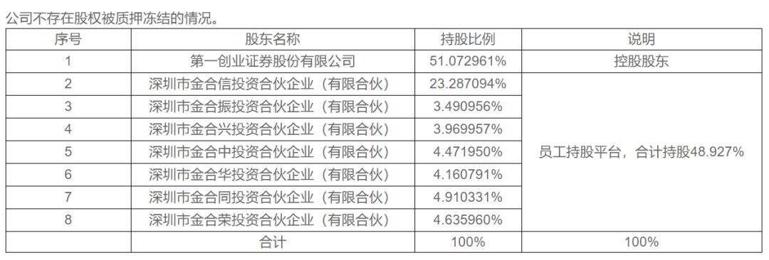 大股東第一創(chuàng)業(yè)證券股份有限公司(下稱“第一創(chuàng)業(yè)證券”)持股51%,為控股股東。此外,以總經(jīng)理蘇彥祝為代表的公司員工,通過深圳市合信投資合伙企業(yè)(有限合伙)等平臺(tái)合計(jì)持股49%。