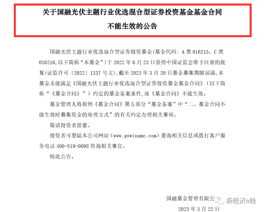 A股市場頻繁震蕩下,缺乏渠道優(yōu)勢(shì)的中小基金公司產(chǎn)品發(fā)行“壓力山大”。3月22日,國融基金發(fā)布公告稱,旗下國融光伏主題行業(yè)優(yōu)選混合型證券投資基金基金合同不能生效。其公告表明,該基金于2022年6月23日獲得中國證監(jiān)會(huì)準(zhǔn)予注冊(cè)的批復(fù)(證監(jiān)許可〔20221337號(hào)文),截至2023年3月20日基金募集期限屆滿,基金未能滿足《國融光伏主題行業(yè)優(yōu)選混合型證券投資基金基金合同》約定的基金備案條件,故《基金合同》不能生效。