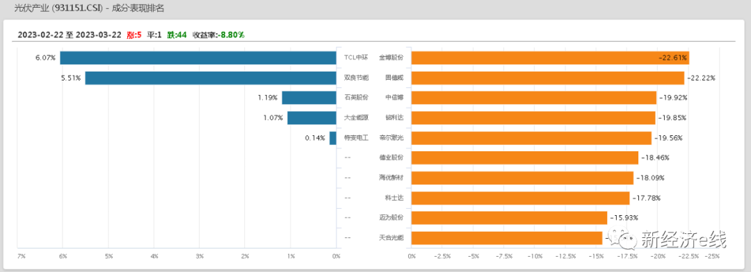 二級(jí)市場上,中證光伏產(chǎn)業(yè)指數(shù)最近一個(gè)月里快速下行。截至3月22日收盤,該指數(shù)前50只成分股中,近一個(gè)月里下跌個(gè)股數(shù)量多達(dá)44只,平盤1只,僅有5只錄得上漲,最近一個(gè)月平均收益率為-8.80%。