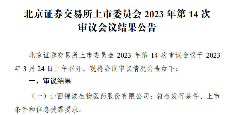 3月24日,北京證券交易所上市委員會召開了2023年第14次審議會議,宣布錦波生物成功過會,首次發(fā)行股數(shù)不超過 500 萬股,發(fā)行底價為50元/股。
