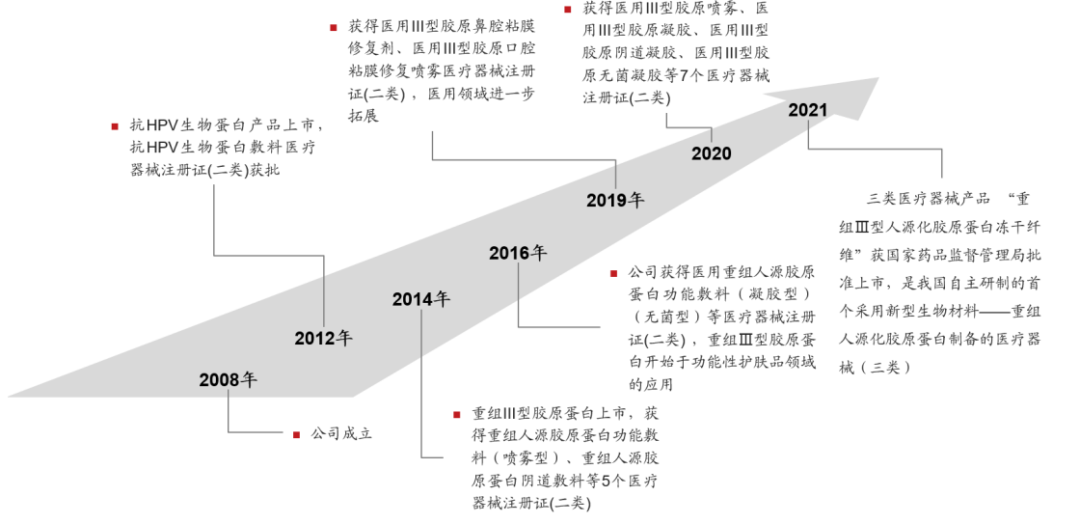 錦波生物成立于2008年,其兩大主營業(yè)務(wù)分別為抗HPV生物蛋白產(chǎn)品和重組膠原蛋白產(chǎn)品,具體產(chǎn)品形態(tài)包括醫(yī)療器械、功能性護(hù)膚品、原料和衛(wèi)生用品。