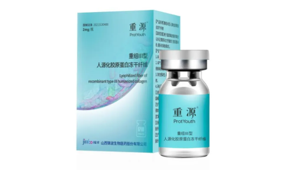 該產(chǎn)品又名為“重源 重組Ⅲ型人源化膠原蛋白凍干纖維”,作為三類醫(yī)療器械在2021年6月獲藥監(jiān)局批準(zhǔn)上市,據(jù)稱是錦波生物自主研發(fā)的國內(nèi)首個注射級A型重組Ⅲ型人源化膠原蛋白三類醫(yī)療器械。