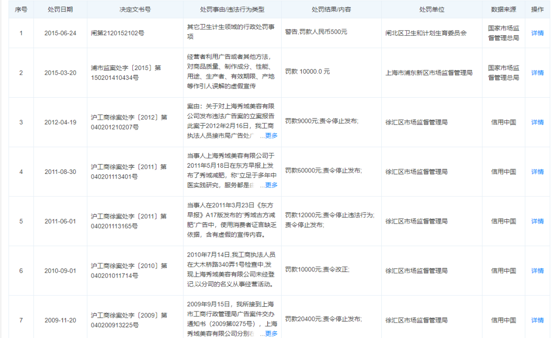 △上海秀域美容有限公司行政處罰記錄(截圖自天眼查)