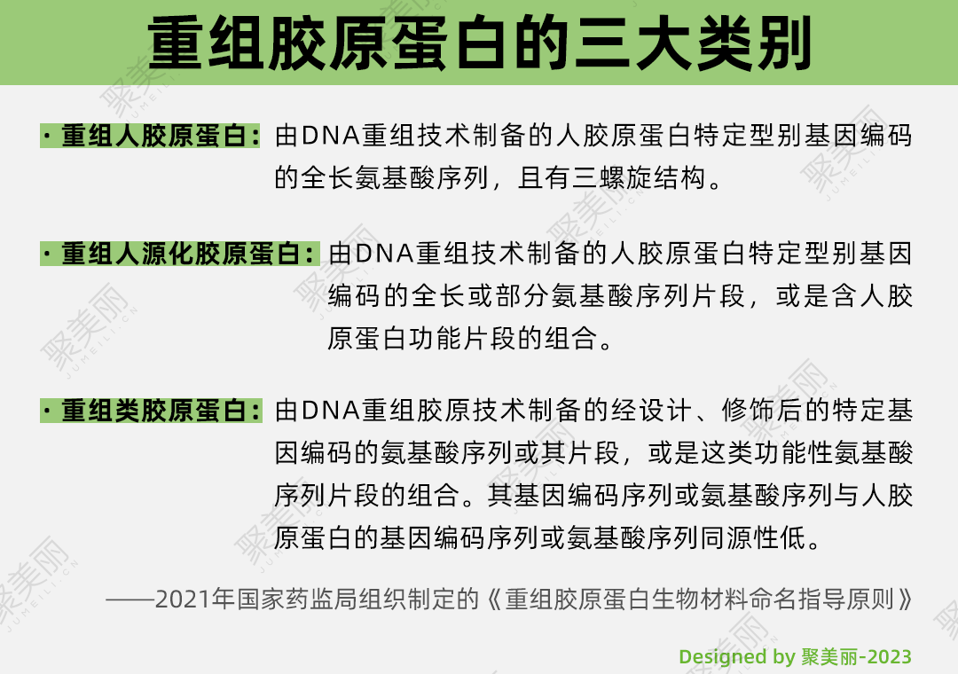 2021年,國家藥監(jiān)局發(fā)布了《重組膠原蛋白生物材料命名指導(dǎo)原則》,明確的把膠原蛋重組膠原蛋白分為三大類:重組人膠原蛋白、重組人源化膠原蛋白和重組類膠原蛋白。
