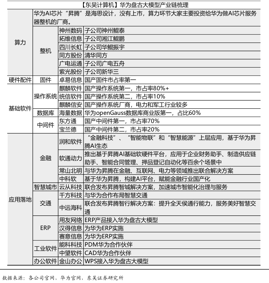 對(duì)于華為盤古大模型產(chǎn)業(yè)鏈,東吳證券進(jìn)行了詳細(xì)的梳理。該券商表示,海外GPT技術(shù)發(fā)展迅速,人工智能產(chǎn)業(yè)革命已經(jīng)到來。算法是決定AI勝負(fù)的關(guān)鍵。算法大邏輯相同,但是精細(xì)的部分會(huì)有差距。其認(rèn)為華為盤古大模型的優(yōu)勢(shì)在于人才儲(chǔ)備和算力自主可控,有望成為國(guó)內(nèi)領(lǐng)先的大模型,其生態(tài)產(chǎn)業(yè)鏈標(biāo)的有望迎來加速發(fā)展。
