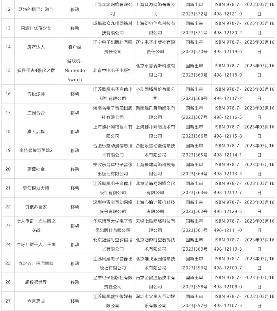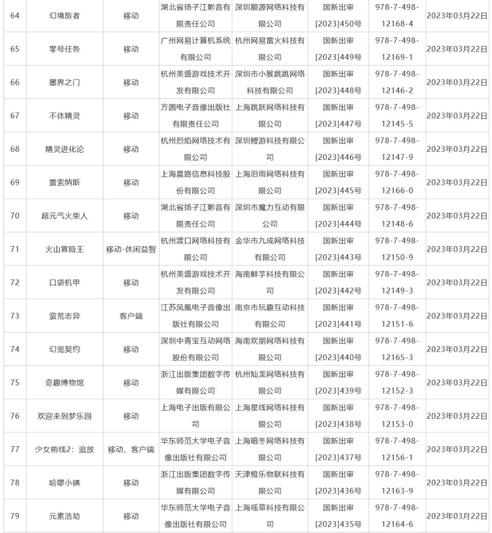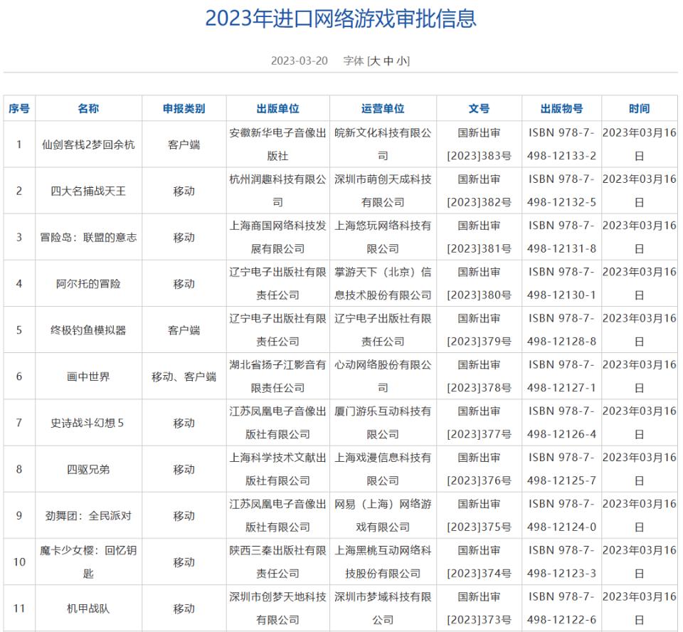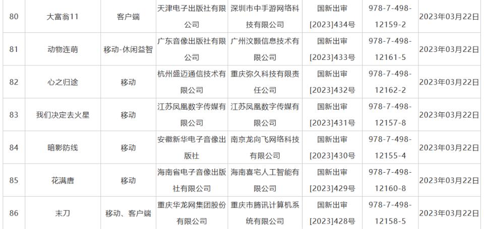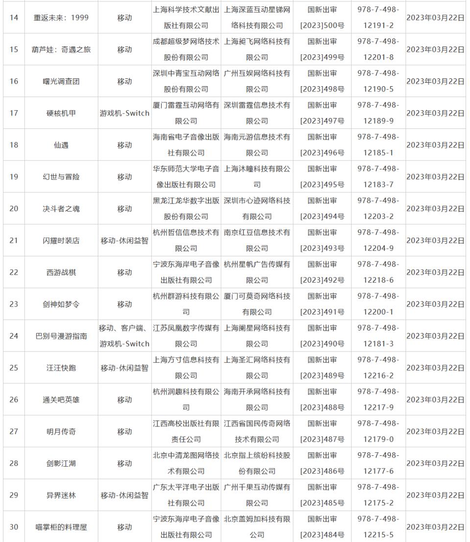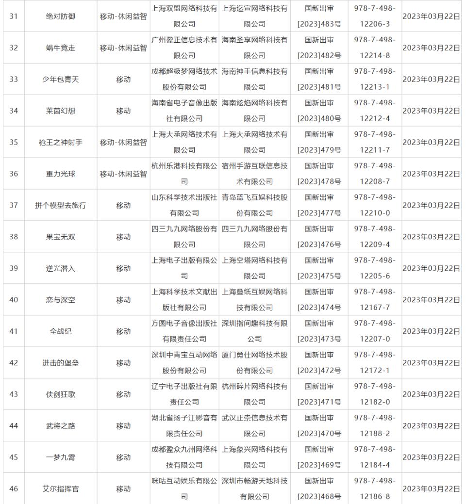附:2023年3月完整版號(hào)名單