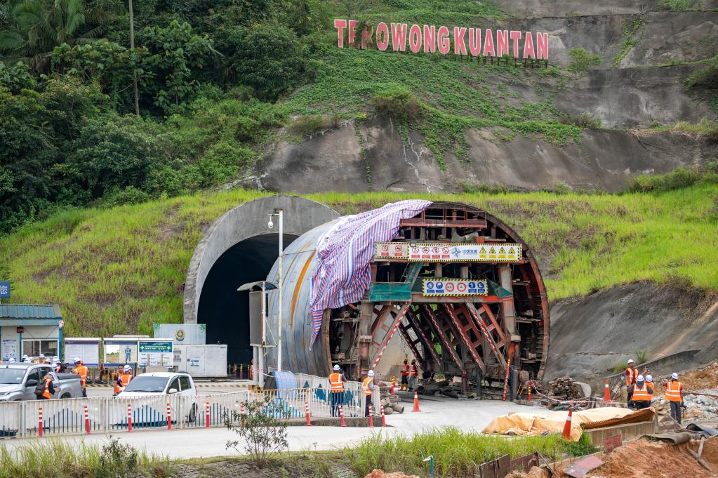 這是3月6日在馬來西亞彭亨州拍攝的馬來西亞東海岸鐵路(馬東鐵)關丹隧道施工現場。