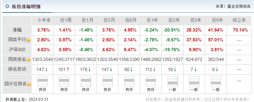 從一季度收益率表現(xiàn)看,富國天惠成長的收益率漲幅為3.76%,漲幅超過同類平均的2.5%,但仍低于滬深300的4.63%漲幅。