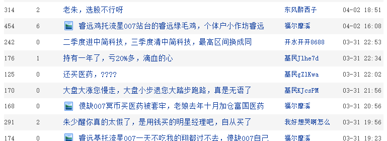 在天天基金網(wǎng)貼吧,有基民吐槽稱,“持有一年了,虧20%多”;還有基民稱,“老朱,選股不行呀”、“還買醫(yī)藥?”等吐槽,主要質(zhì)疑基金經(jīng)理的選股能力。