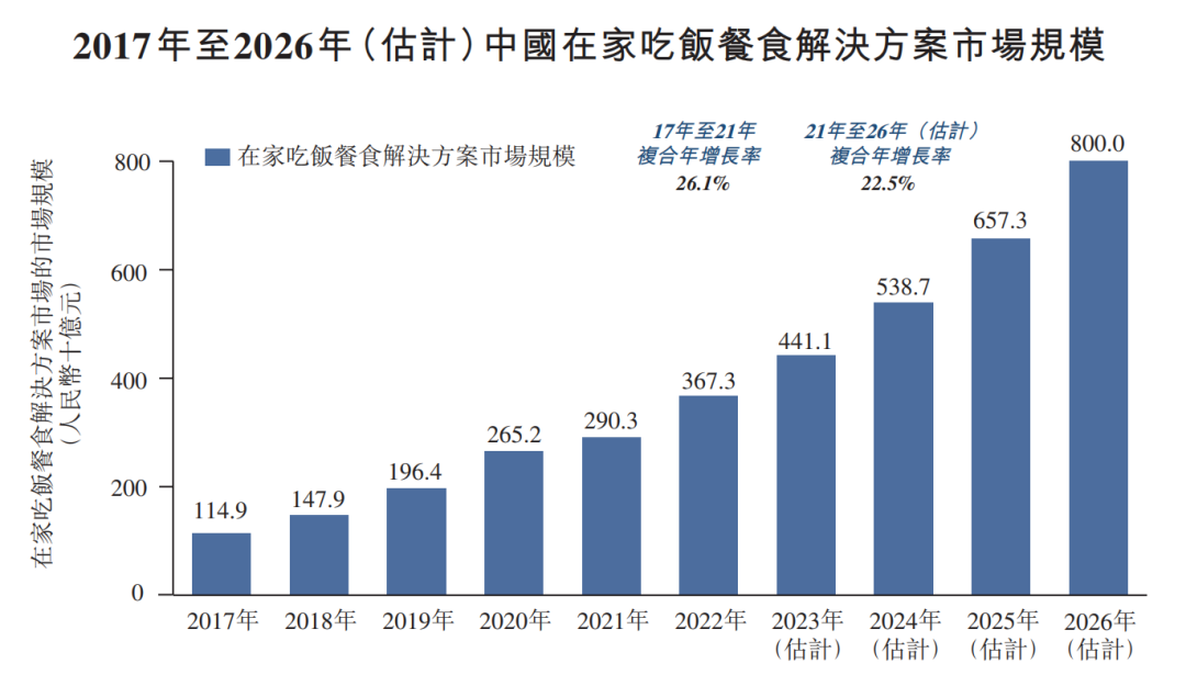 此外,在家吃飯餐食解決方案預(yù)計(jì)于2021~2026年成為中國餐飲行業(yè)增長最快的細(xì)分賽道。這塊市場在2017年的總收入規(guī)模約為1149億元,2021年增至2903億元,年復(fù)合增長率為26%;2026年有望達(dá)到8000億元。