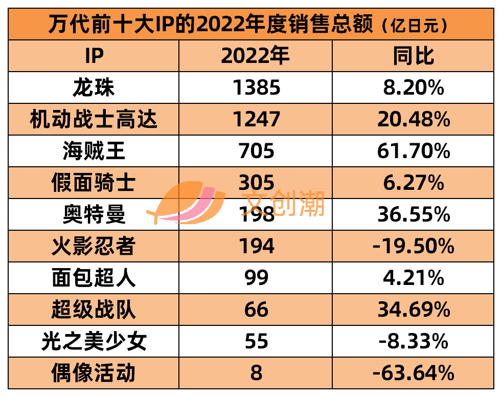 有數(shù)據(jù)顯示,面包超人IP關(guān)聯(lián)商品早在2010年就已達(dá)1.1萬億日元。2022年,僅萬代一家的面包超人IP銷售額為99億日元,同比增長(zhǎng)4.21%。