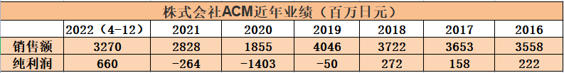 文創(chuàng)潮查閱日本電視臺(tái)最新財(cái)報(bào)注意到,2022年4-12月,株式會(huì)社ACM銷售額32.7億日元,純利潤(rùn)6.6億日元。