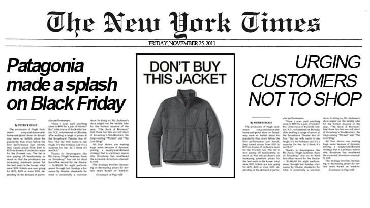 在「把公司捐給地球」之前,Patagonia還有一次特別出圈的營(yíng)銷活動(dòng)。2011年的美國購物節(jié)“黑色星期五“,Patagonia在《紐約時(shí)報(bào)》整個(gè)版面打出了“Don't buy this jacket(不要買這件夾克)”的廣告,呼吁大眾“多思考少消費(fèi)”,并且在黑五期間下架了所有產(chǎn)品。