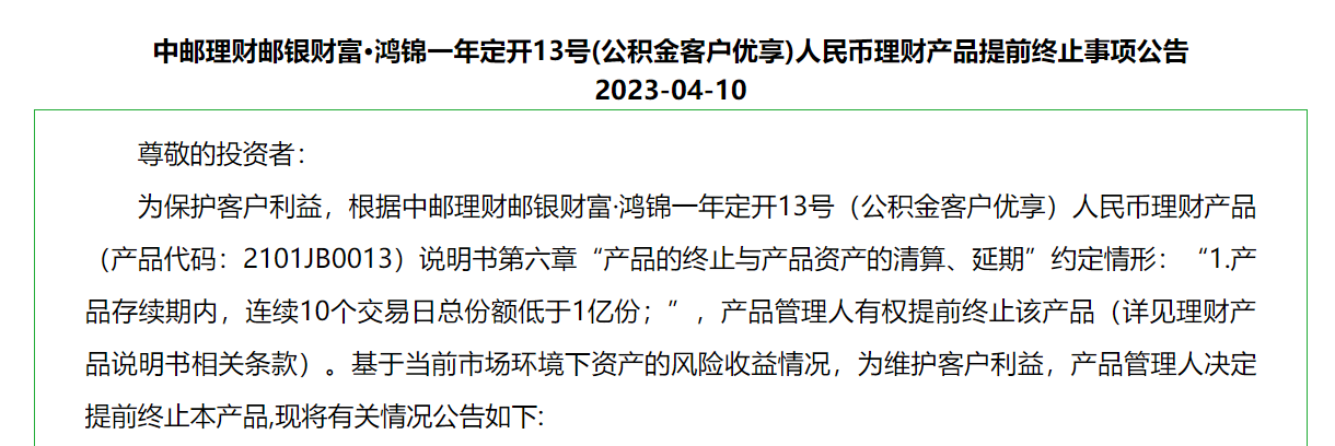 4月10日,中郵理財發(fā)布一則提前終止公告,表示“基于當前市場環(huán)境下資產(chǎn)的風(fēng)險收益情況,為維護客戶利益”,決定將“中郵理財郵銀財富·鴻錦一年定開13號(公積金客戶優(yōu)享)人民幣理財產(chǎn)品(產(chǎn)品代碼:2101JB0013)”(以下簡稱“13號理財產(chǎn)品”)提前終止。