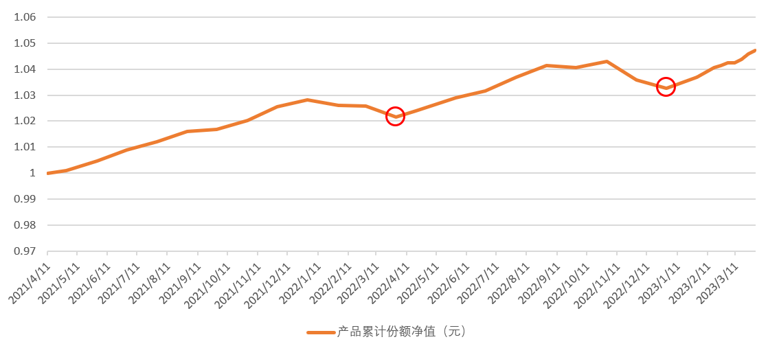 根據(jù)13號理財產(chǎn)品成立以來凈值數(shù)據(jù)可見,其隨整體未出現(xiàn)破凈,但去年3月、12月期間均出現(xiàn)較大幅度的凈值波動。尤其在2022年3月31日,其凈值達到全年最低值1.0217。彼時,受股債市場波動影響,銀行理財遭遇大面積破凈。