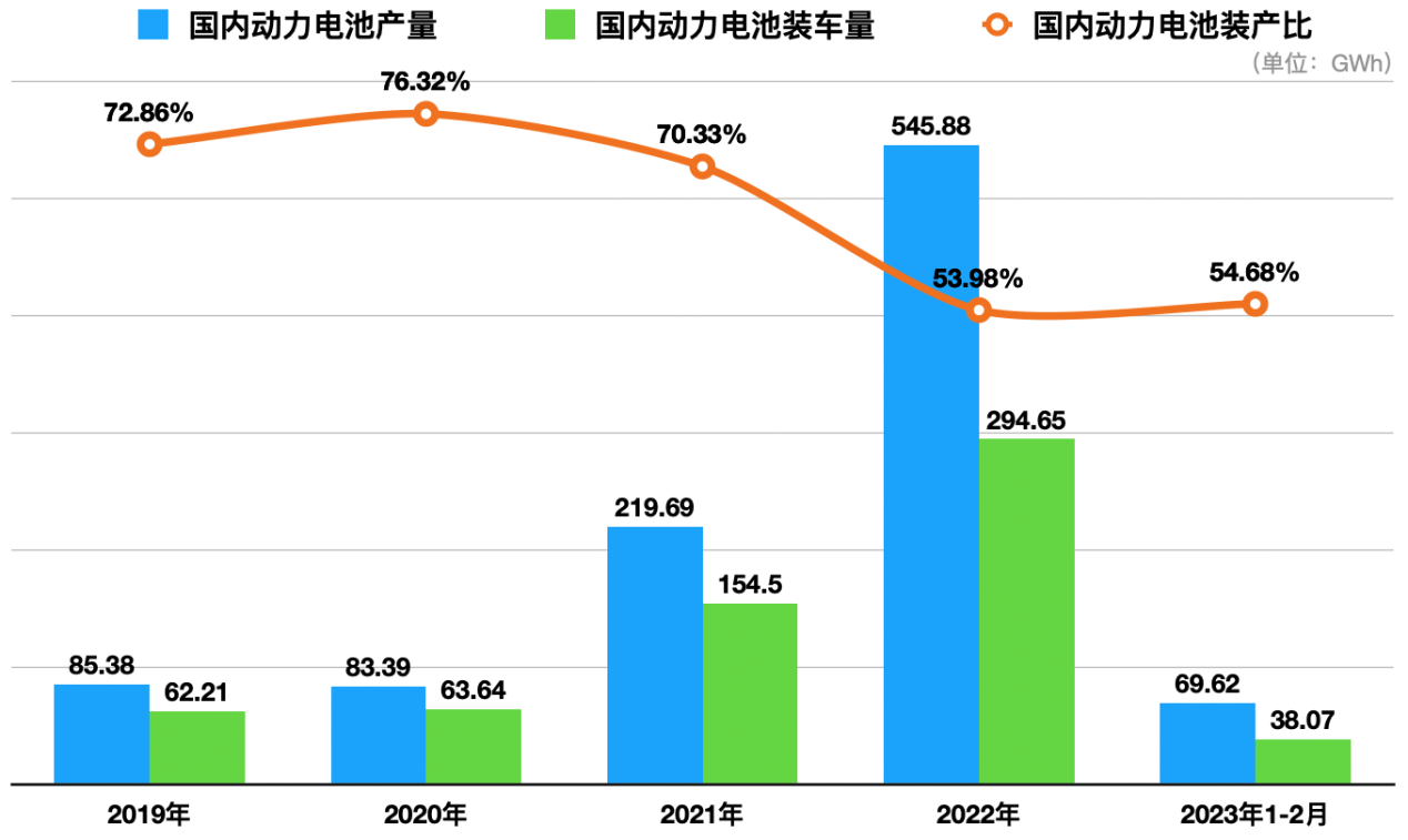 電池聯(lián)盟數(shù)據(jù)顯示,2021和2022年,國內(nèi)動力電池電池裝車量分別為154.5GWh和294.65GWh,相對產(chǎn)量而言,裝車量的同比增速稍慢。尤其值得注意的是,裝車量在產(chǎn)量中的占比逐漸降低,從2019年的76.32%,降至2022年的53.98%。