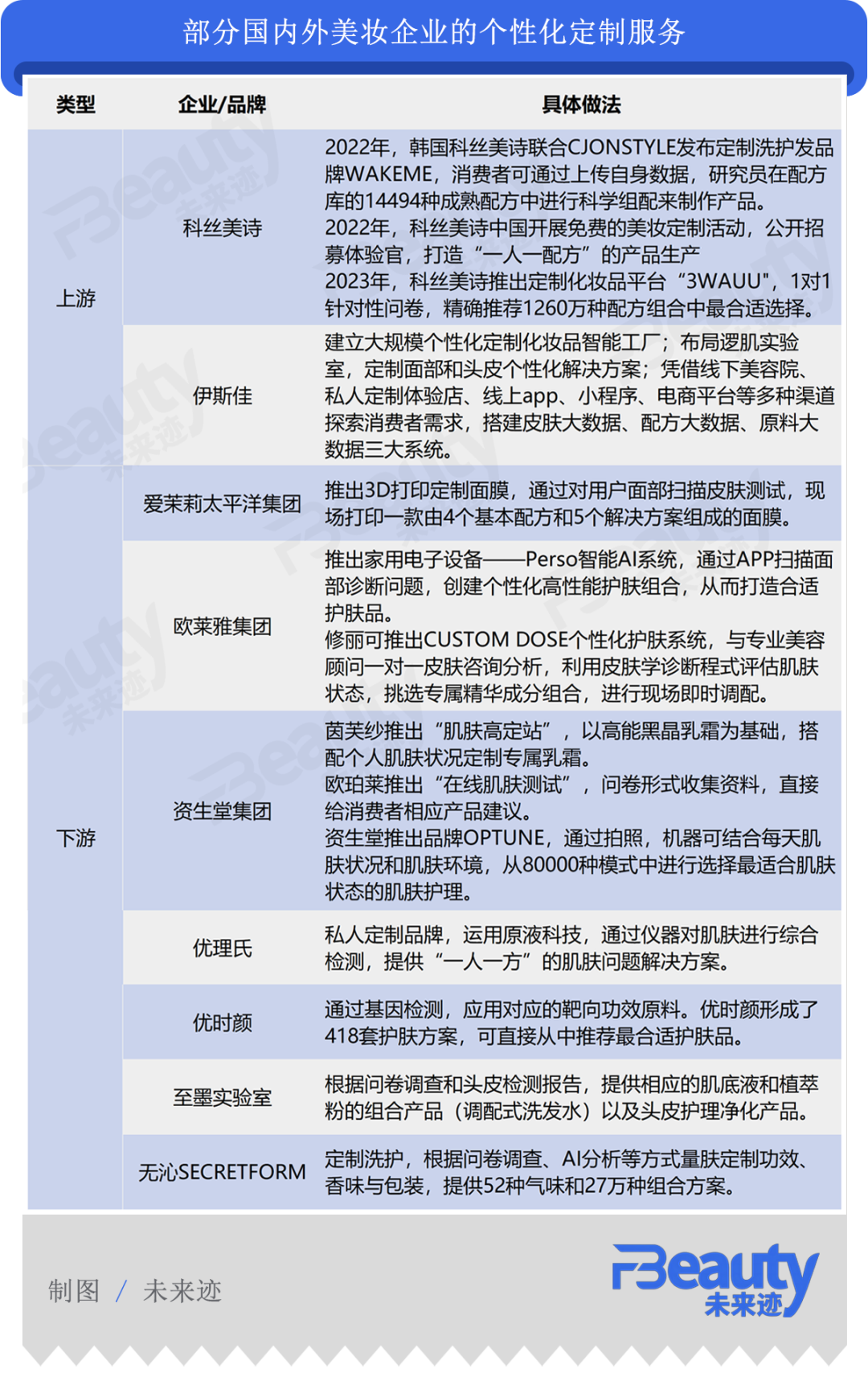 《FBeauty未來(lái)跡》發(fā)現(xiàn),“個(gè)性化定制”概念可分為兩大類(lèi):1、一人一配方的“完全”定制。2、提供多種、有限的方案基礎(chǔ)上,匹配肌膚的最佳“定制”。