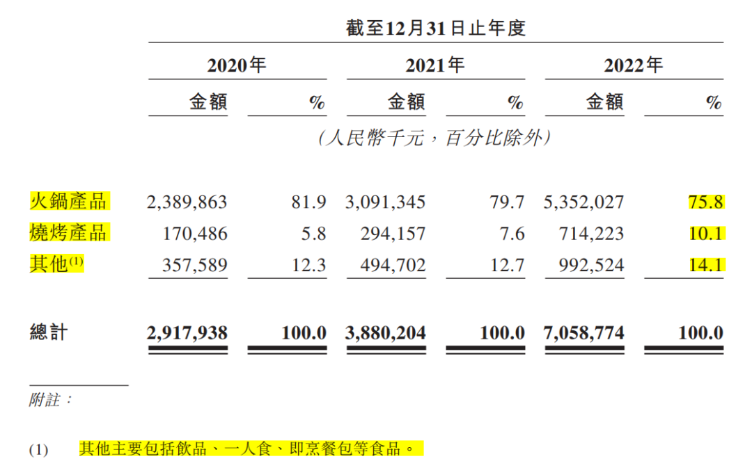 我們先來看產品和習慣層面,仔細研究招股書就不難發(fā)現(xiàn),火鍋產品為鍋圈貢獻了近8成的收入,其2022年帶來收入53.5億元,占比75.8%;其次才是其他產品(飲品、一人食、即烹餐包等),營收為9.9億元,占比14.1%;最后是燒烤產品,營收7.1億元,占比10.1%。