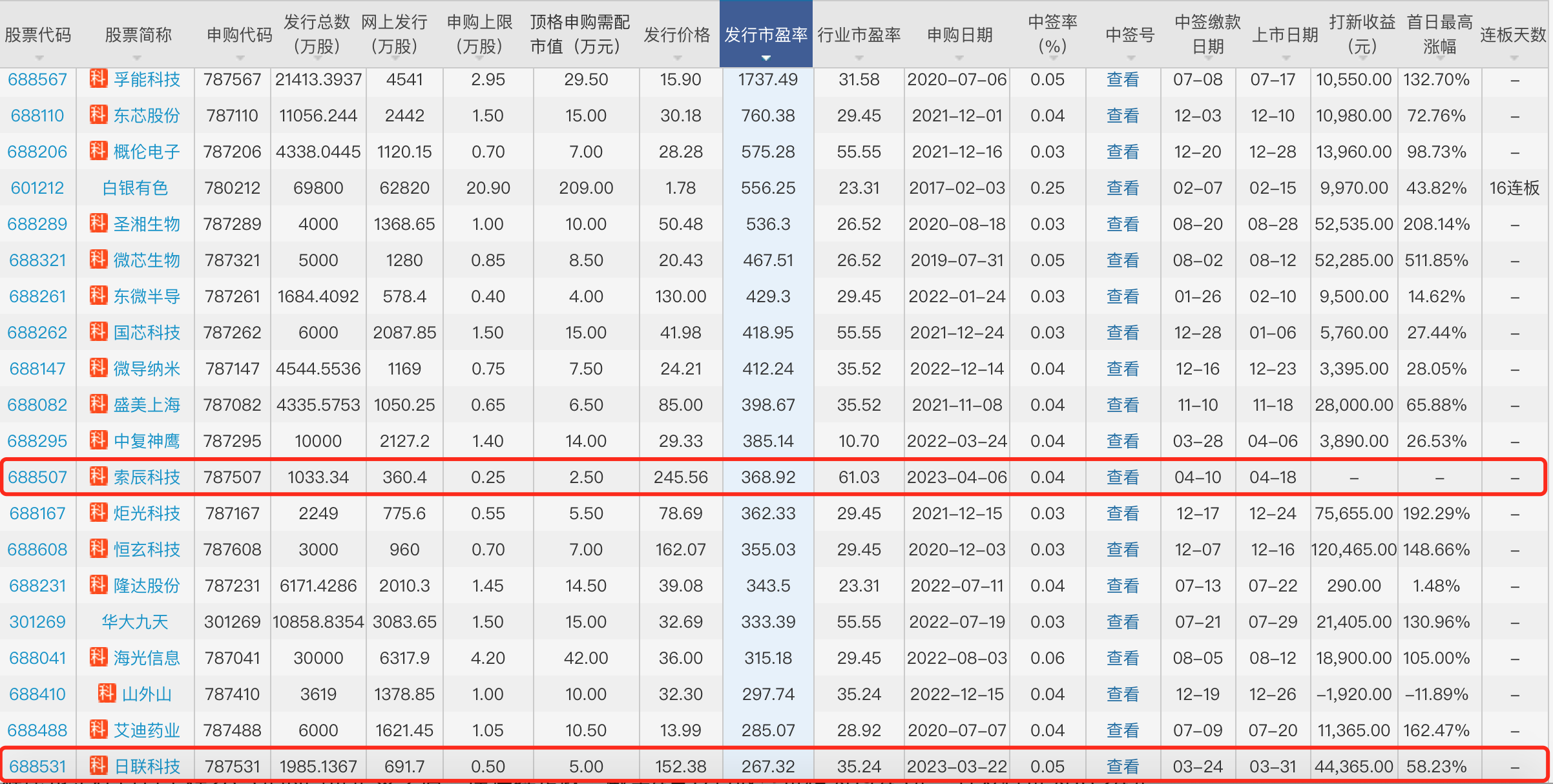 無獨有偶。3月22日申購,3月31日上市的日聯(lián)科技(688531.SH)同樣以267.32倍的發(fā)行市盈率,躋身歷史前列,其所處行業(yè)市盈率為35.24倍。日聯(lián)科技的發(fā)行價152.38元,同樣不低。日聯(lián)科技網(wǎng)上發(fā)行最終中簽率為0.04795068%,同樣也有網(wǎng)上棄購,棄購數(shù)量130.8088萬股,網(wǎng)上棄購金額1.99億元,比索辰科技還多。