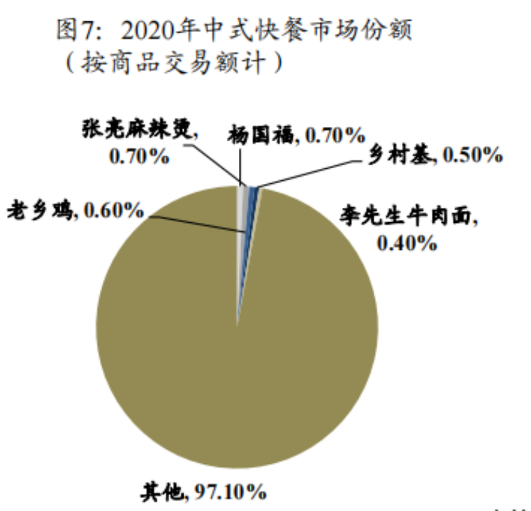 按照商品交易額來計算的話,2020年,中式快餐市場排名前五的品牌只有2.9%。