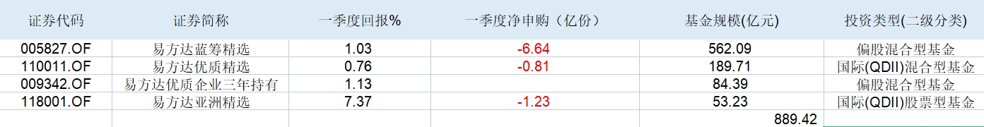 業(yè)績回暖日,基民贖回時(shí)。一季度,除了易方達(dá)優(yōu)質(zhì)企業(yè)三年持有處于封閉期內(nèi),其余三只基金均遭到了凈贖回。其中易方達(dá)藍(lán)籌精選的凈贖回份額為6.64億份。受此影響,張坤的總管理規(guī)模較去年年末有所降低,為889.42億元。