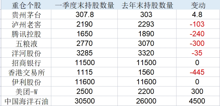 或許正是10%紅線,張坤對瀘州老窖、騰訊控股、五糧液、洋河股份都有減持。而貴州茅臺(tái)、美團(tuán)-W(03690.HK)、中國海洋石油(00883.HK)是3只在一季度獲得增持的股票。其中,貴州茅臺(tái)重登第一大重倉股,中國海洋石油取代藥明生物,在這一季度新入前十重倉股之列。