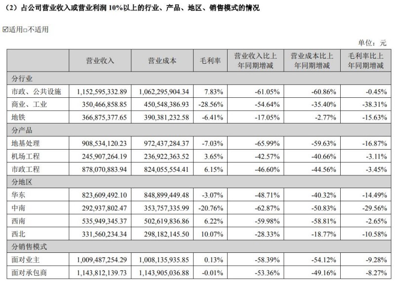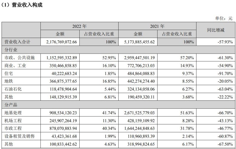 根據(jù)2022年年報,中化巖土各行業(yè)業(yè)務(wù)板塊收入同比均出現(xiàn)了較大幅度的下降。其中住宅業(yè)務(wù)板塊由上一年4.85億元下降至2022年度的0.40億元,同比下降91.70%;另外石油石化,市政、公共設(shè)施,商業(yè)、工業(yè)等業(yè)務(wù)板塊的收入同比也出現(xiàn)了63.04%、61.30%和54.90%的下降。