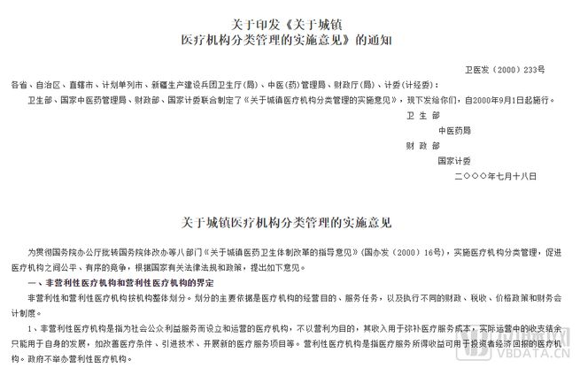 2000年,原衛(wèi)生部發(fā)布的《關(guān)于城鎮(zhèn)醫(yī)療機(jī)構(gòu)分類管理的實(shí)施意見》