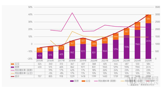 一個(gè)標(biāo)志性的事件是,從2015年開始,民營口腔醫(yī)院的數(shù)量開始超過公立口腔醫(yī)院(國家衛(wèi)健委數(shù)據(jù)),且雙方的數(shù)量差距不斷拉大,民營口腔醫(yī)院在口腔??漆t(yī)院的數(shù)量占比逐年提升,這也帶動(dòng)民營口腔市場不斷擴(kuò)容。