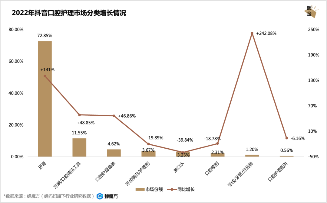 這一賽道在去年收獲了飛速增長,以抖音為例,2022年口腔護(hù)理市場同比增長82.14%,品牌們紛紛發(fā)起對這一增量市場的進(jìn)攻。