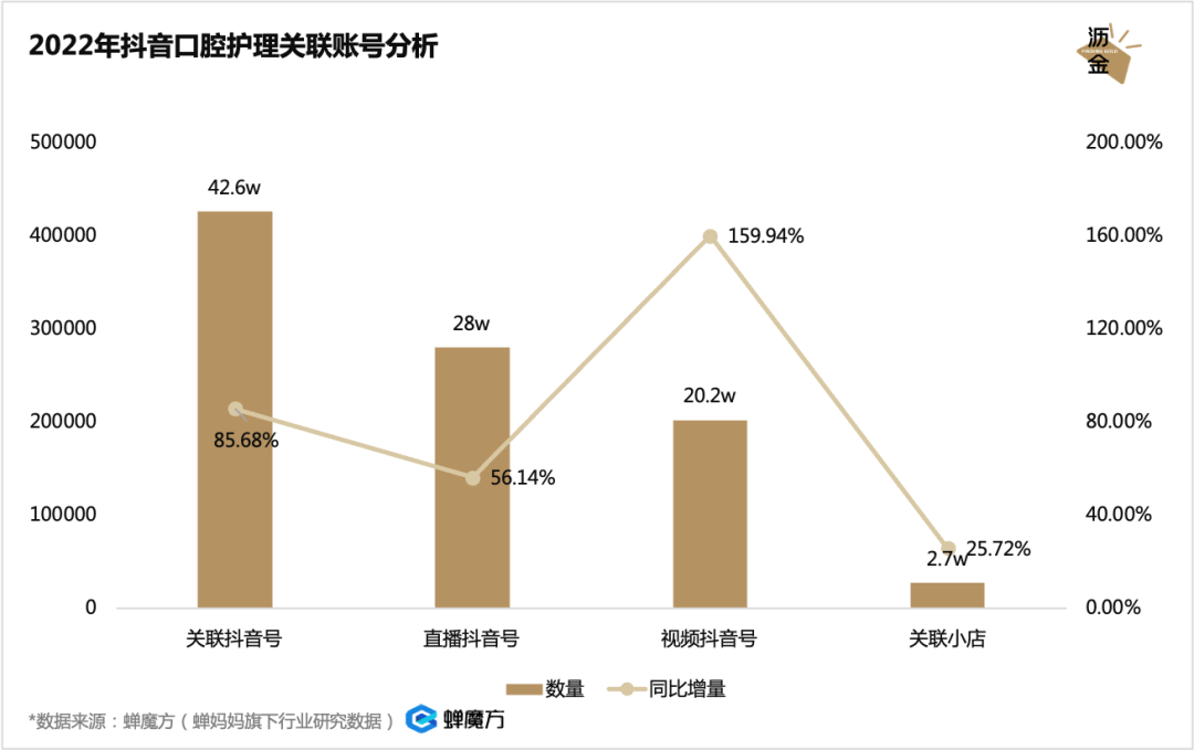 伴隨口腔賽道漲勢迅猛,抖音的關(guān)聯(lián)賬號數(shù)和內(nèi)容數(shù)量也迎來增長高峰。2022年,口腔護(hù)理關(guān)聯(lián)抖音號數(shù)達(dá)到42.6萬個,增幅85.86%;而直播抖音號數(shù)達(dá)到28萬個,同比增幅56.14%。