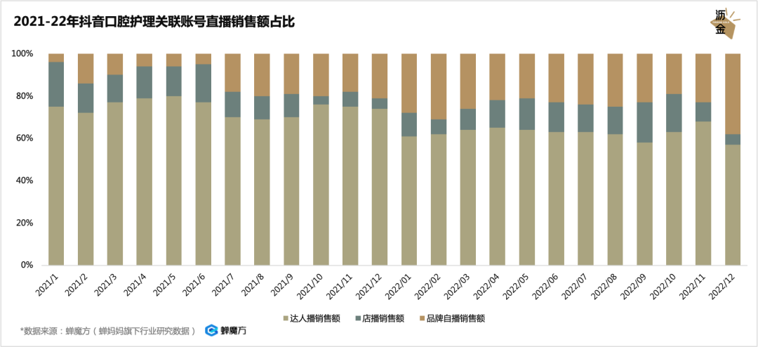 再來看看品牌銷量的主要來源。去年開始,口腔護(hù)理市場來自品牌自播和店播的銷售額顯著增加,達(dá)播的占比有所下滑。