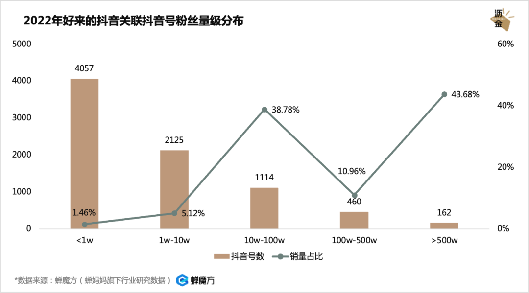 2022年好來的抖音關(guān)聯(lián)抖音號粉絲量級分布