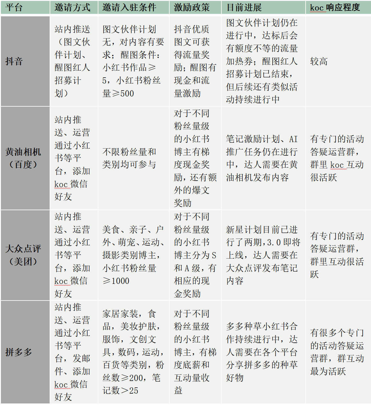 經(jīng)過對比后發(fā)現(xiàn),每個平臺在挖角時,一般會針對KOC的粉絲量級做以激勵區(qū)分,入駐條件和機制也有所不同,詳見下表。