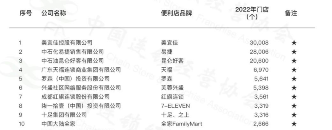 2014年開(kāi)始,美宜佳走上全國(guó)擴(kuò)張路線,近期中國(guó)連鎖經(jīng)營(yíng)協(xié)會(huì)(下稱CCFA)“2022年中國(guó)便利店TOP100”榜單顯示,美宜佳以30008家的門店數(shù)量反超背靠中石化的易捷,成為全國(guó)便利店行業(yè)第一。這個(gè)門店數(shù)量,是第五名羅森的5倍,第十名全家的10倍。