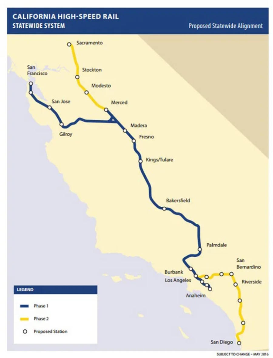 那時(shí),施瓦辛格已經(jīng)卸任州長(zhǎng)4年了,美國總統(tǒng)也換了兩任,而這條原本計(jì)劃2020年通車,總長(zhǎng)僅840公里的美國高鐵項(xiàng)目也遭到了冷遇。