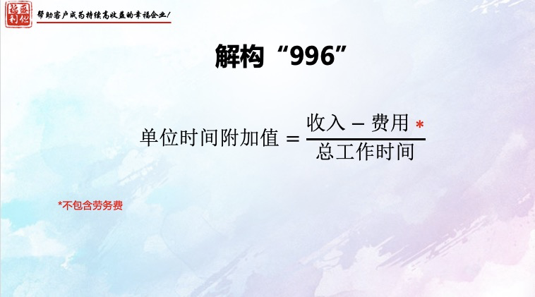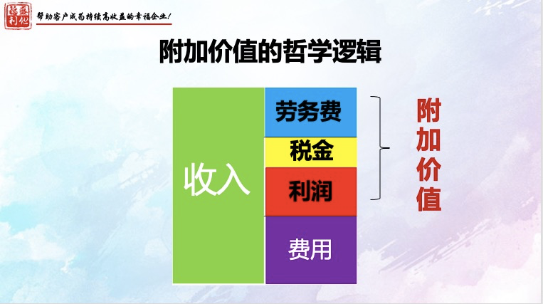 這個時候邏輯就變了,它轉(zhuǎn)移到了企業(yè)的外部——提升收入,縮短時間,提高效率。假設(shè)通過一年的努力,勞務(wù)費如愿提升了50%,基于正確的模型,附加價值也提升了50%,這就意味著利潤也提升了50%。這是很奇妙的事情,而且納稅也會同比提升50%。