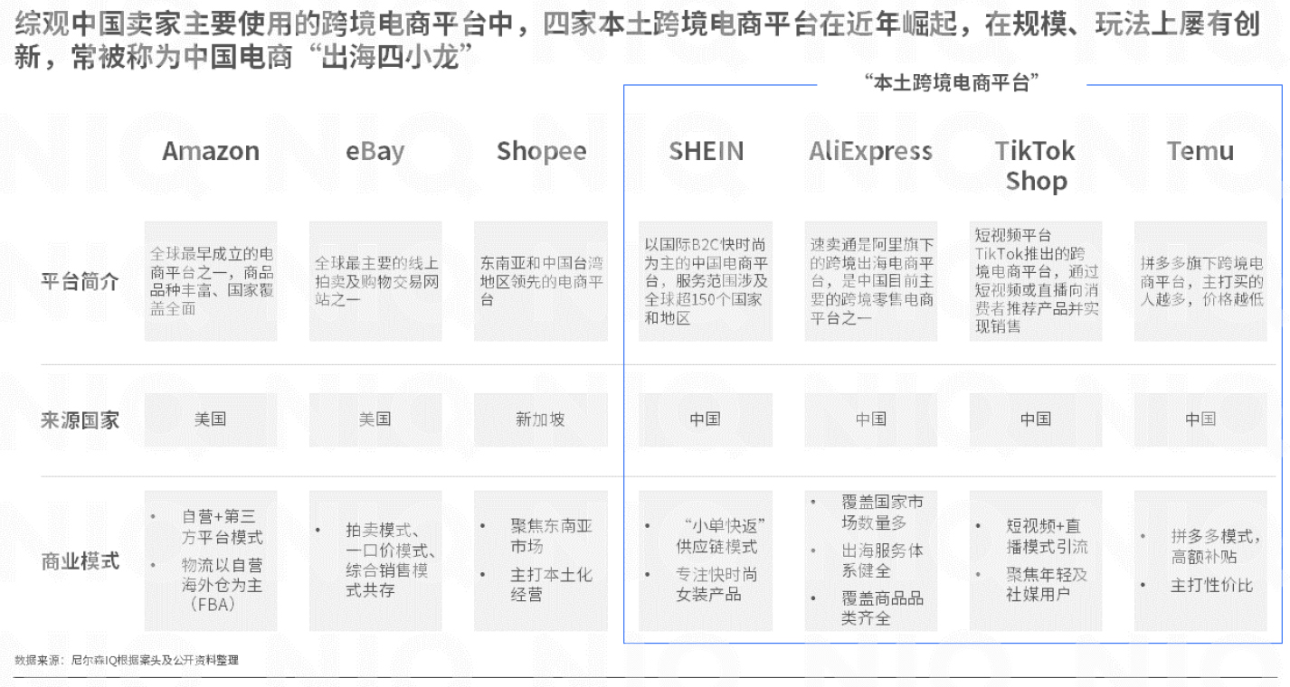 近日,尼爾森發(fā)布《2023年中國跨境電商平臺出海白皮書》,深度闡釋了基于B2C模式的SHEIN、速賣通、Temu、TikTok Shop的各自優(yōu)勢。這四家平臺如今常被業(yè)內(nèi)稱為中國電商“出海四小龍”。