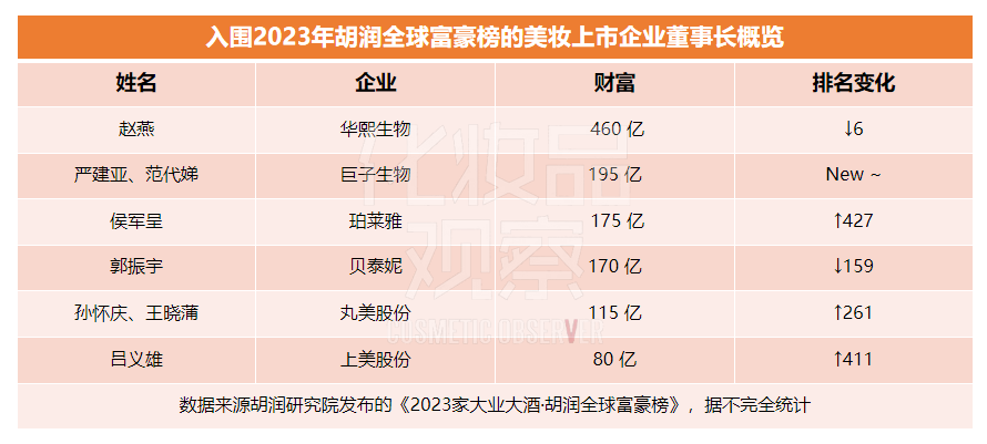 根據(jù)胡潤(rùn)研究院發(fā)布的《2023家大業(yè)大酒·胡潤(rùn)全球富豪榜》,趙燕以460億身價(jià)居美妝企業(yè)董事長(zhǎng)富豪榜榜首,排在全球富豪榜第395位;嚴(yán)建亞、范代娣夫婦以195億身價(jià)新入榜單,位居國(guó)貨美妝上市企業(yè)第二。