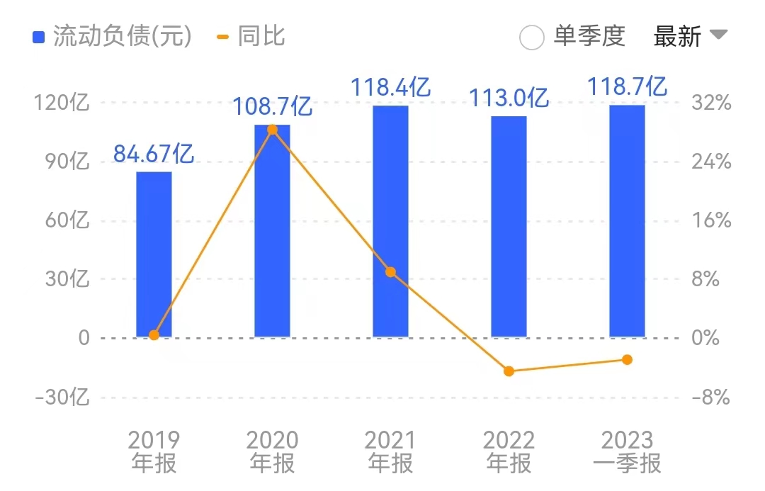 截至今年一季度末,公司負債合計179.96億元,流動負債高達118.69億元,其中短期借款41.81億元,一年內(nèi)到期的非流動負債10.83億元,應(yīng)付票據(jù)25.54億元。