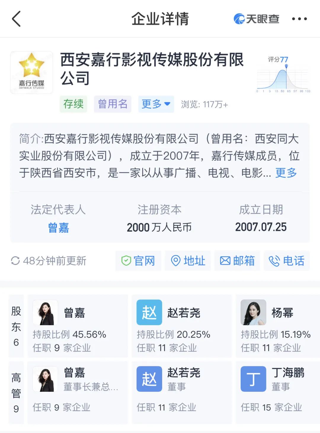 嘉行傳媒的創(chuàng)始人一共有三位,楊冪及其經(jīng)紀人趙若堯和曾嘉。天眼查資料顯示,曾嘉、趙若堯分別持有西安嘉行影視傳媒股份有限公司約45.56%、20.25%,為前兩大股東;楊冪持股約15.19%,為第三大股東。其中曾嘉是嘉行傳媒最大的股東和實際控制人。