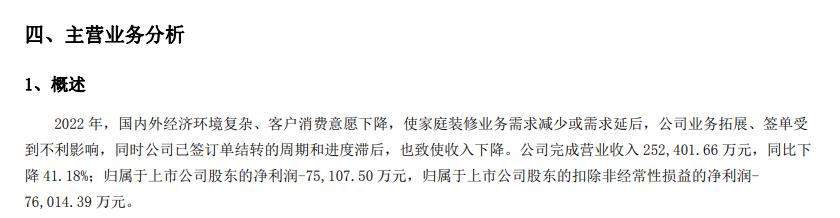 年報(bào)顯示,2022年東易日盛營收約25.24億元,同比下降41.18%;歸屬于上市公司股東的凈利潤(rùn)虧損約7.51億元