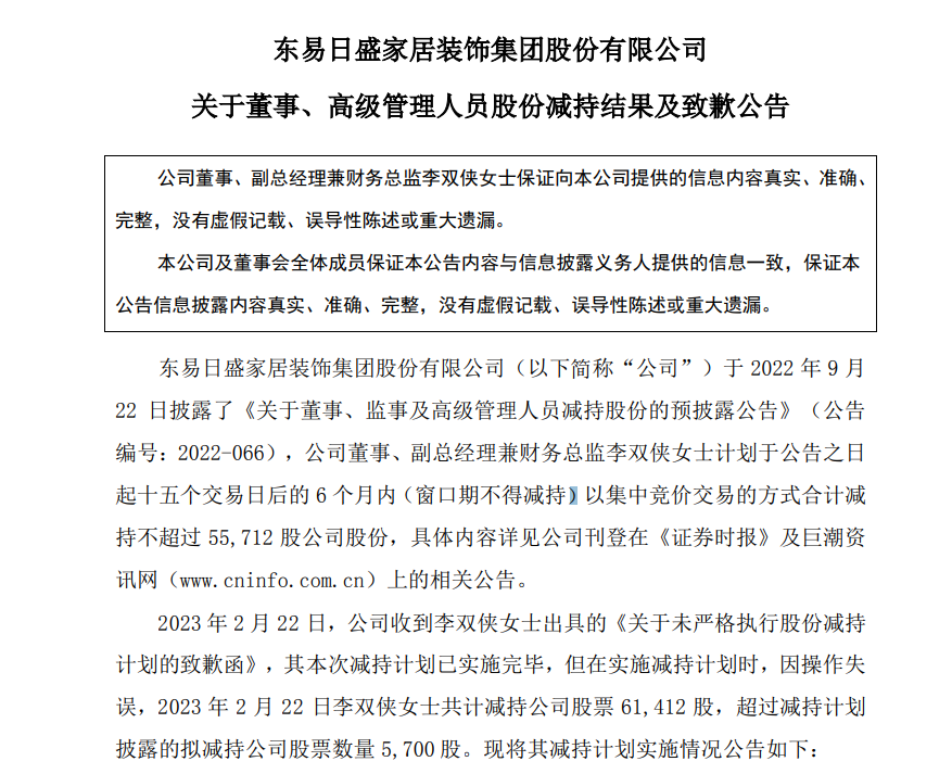 在2023年年內(nèi),東易日盛就有董事、副總經(jīng)理劉勇,監(jiān)事會(huì)主席李永紅,董事會(huì)秘書、副總經(jīng)理管哲,董事、副總經(jīng)理兼財(cái)務(wù)總監(jiān)李雙俠進(jìn)行了減持操作。其中李雙俠還因超額減持進(jìn)行了公開致歉。