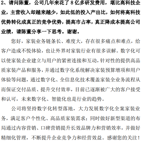 在2023年5月9日的投資者交流會(huì)上,就有投資者向東易日盛董事長(zhǎng)陳輝發(fā)問:“公司幾年來花了8億多研發(fā)費(fèi)用,堪比高科技企業(yè),主營收入?yún)s越來越少,如何真正降成本提高公司業(yè)績(jī)?”