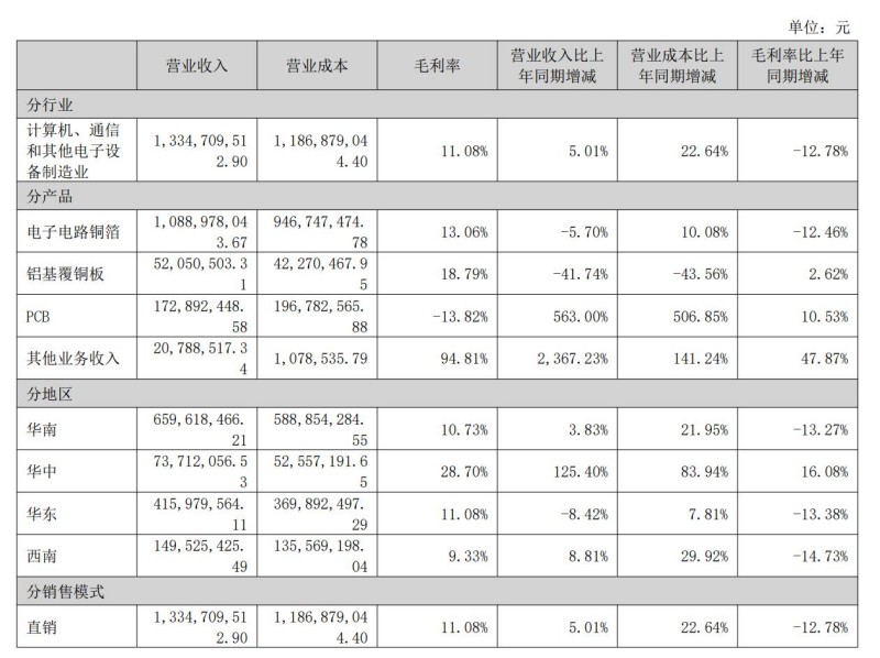 就在收入下降的同時,電子電路銅箔的毛利率為13.06%,和上年相比,減少了12.46個百分點(diǎn),毛利率幾乎“砍半”。