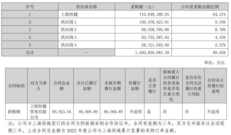 其中,逸豪新材2022年向上海恒越貿(mào)易有限公司(以下簡稱“上海恒越”)采購金額達(dá)7.17億元,占年度采購總額的比例為64.21%,主要采購商品為陰極銅。僅第一大供應(yīng)商的采購額就超六成;而且上海恒越是貿(mào)易商,并非最初生產(chǎn)商,采購價格是否具有優(yōu)勢?年報并未詳細(xì)說明。