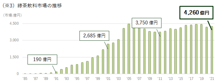 盡管目前日本綠茶飲料市場已有許多強(qiáng)勁對手,但不斷發(fā)展的市場也是朝日推出綠茶新品的機(jī)會點。與2001年前相比,2021年日本的綠茶飲料市場規(guī)模增長了約1.5倍[2]。