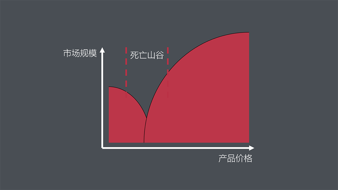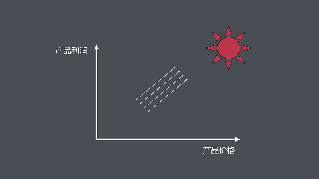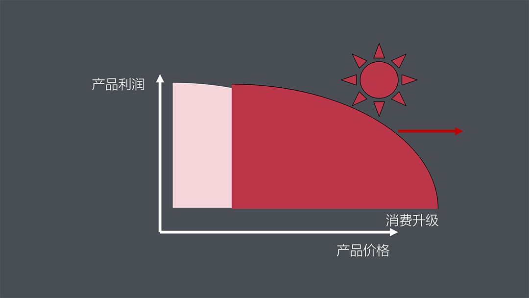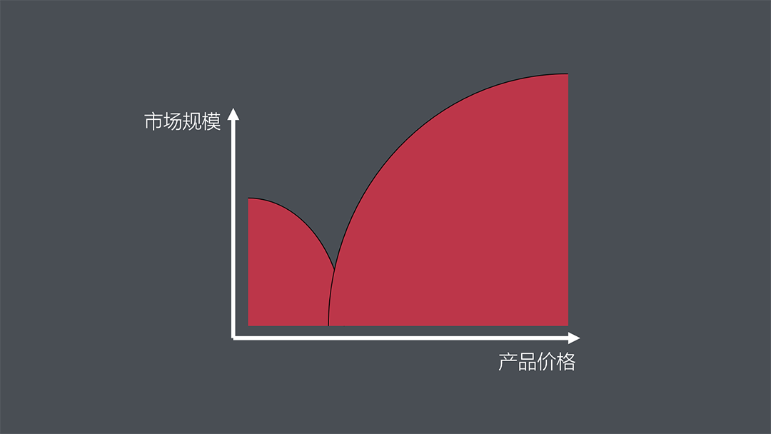 東北角吸引力也帶來一個弊端:通常情況下,品類潛在市場規(guī)模沿東北向遞減。價格越低、市場越大;價格越高,潛在容量就越低。